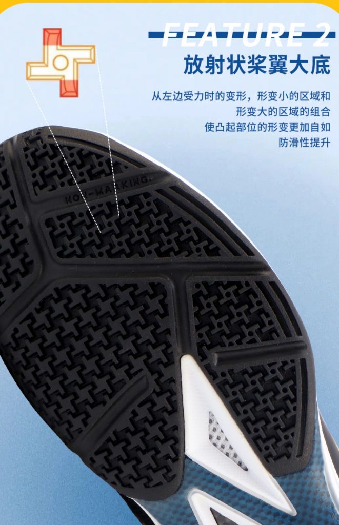 – RADIAL BLADE SOLE: Một hình dạng mới “Đế lưỡi hướng tâm” giúp thúc đẩy biến dạng hoa văn được áp dụng cho đế. Bằng cách kết hợp các khu vực có biến dạng lớn và các khu vực có biến dạng nhỏ, độ bám theo các hướng dọc, ngang và chéo đã được cải thiện.